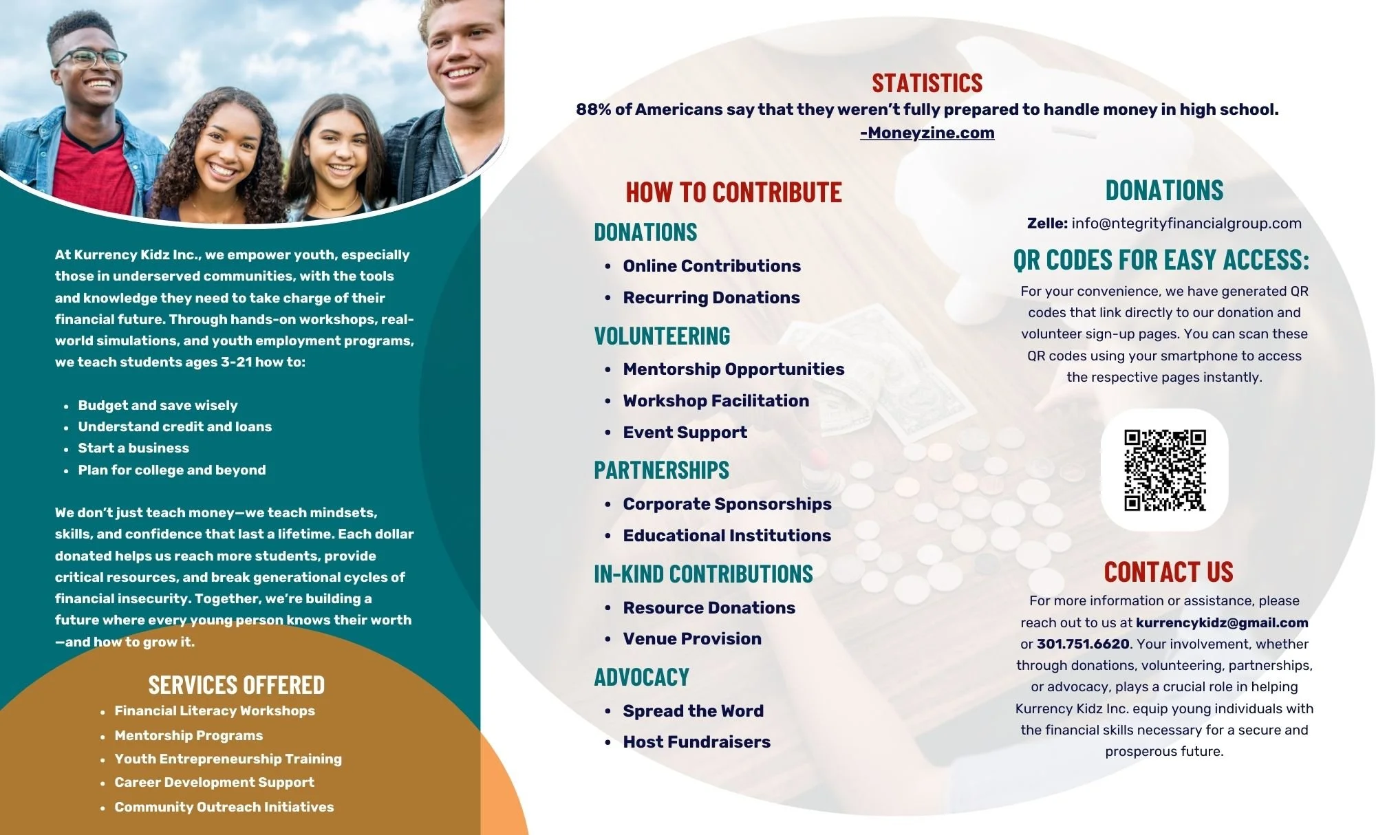 KurrencyKidz Inc. Foundation is dedicated to promoting financial literacy and empowerment in our community. They aim to support our Financial Literacy Empowerment Program, which seeks to cultivate financial competency in young people, enabling them to make informed life decisions. The brand design is inspired by the founder's grandson, King, and the spirit of Toys R Us.