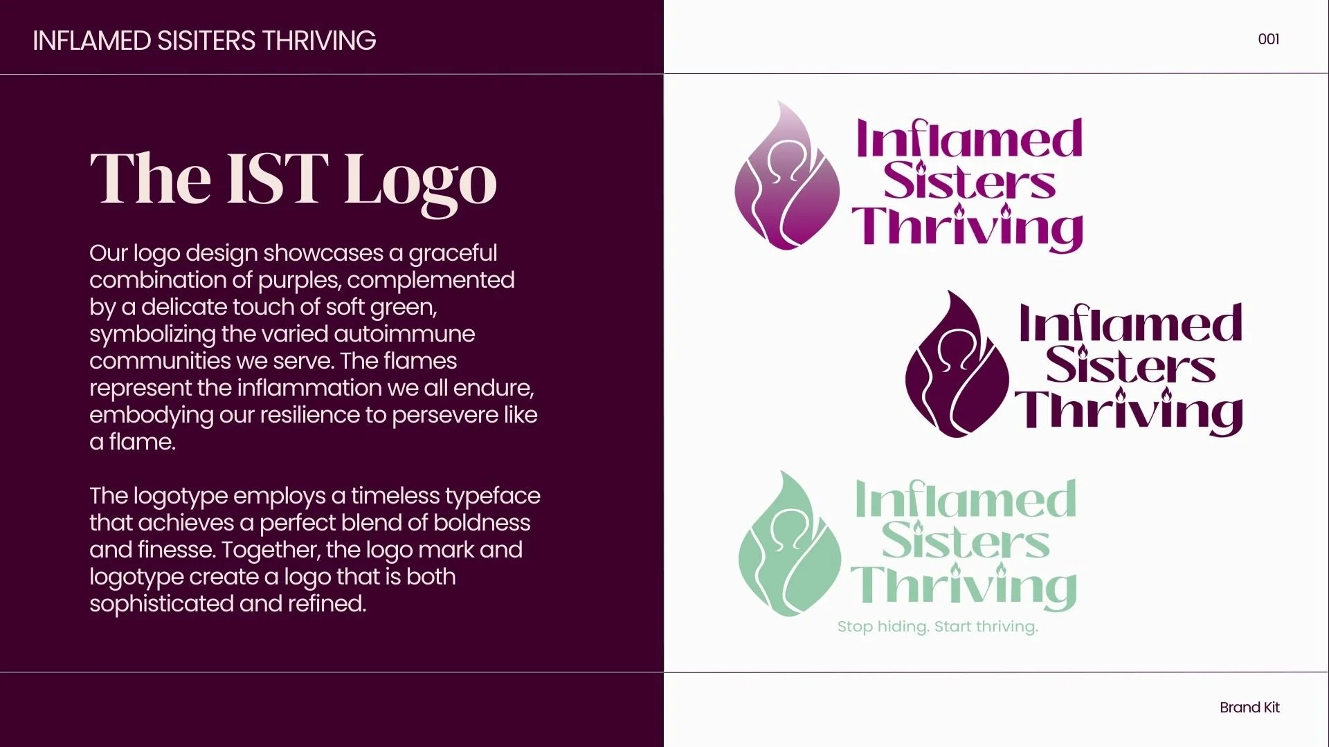 For Inflamed Sisters Thriving, I chose a sophisticated and refined font. The color palette showcases a graceful combination of purples, complemented by a delicate touch of soft green, symbolizing the varied autoimmune communities we serve. The flames represent the inflammation we all endure, embodying our resilience to persevere like a flame. Together, the logo mark and logotype create a logo that is both sophisticated and refined.